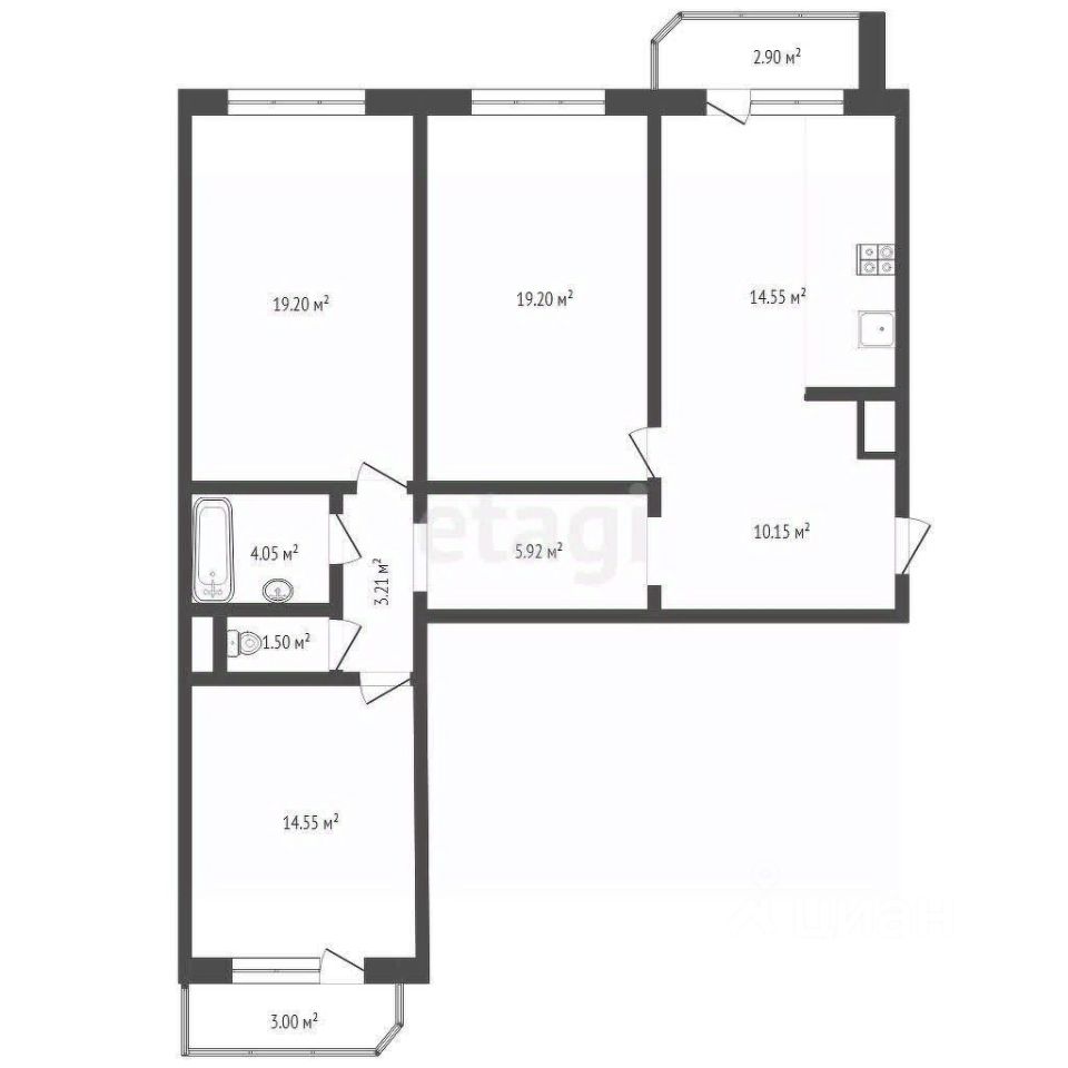 Планировка включает в себя: просторную кухню-гостиную с выходом на балкон, три отдельных комнаты (одна из них с выходом на балкон), раздельный санузел.