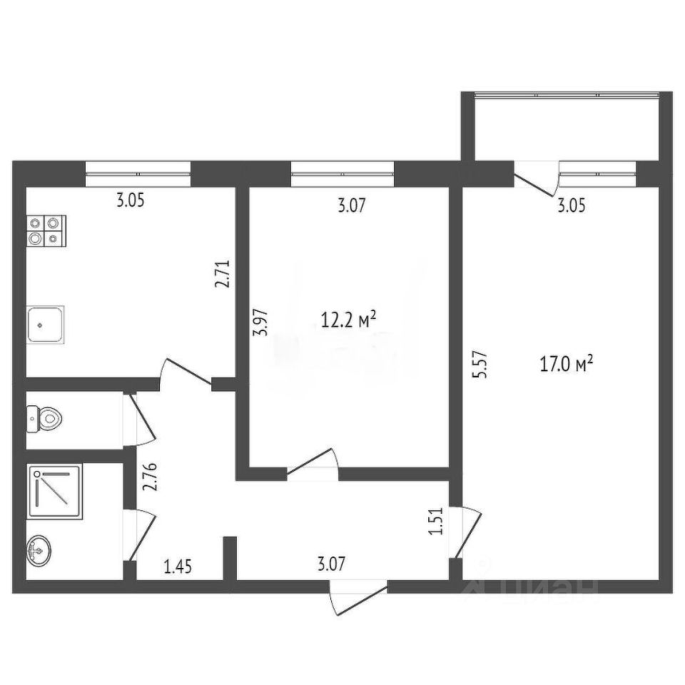 Две изолированные комнаты, одна разделена нишей — удобно выделить спальню и рабочее место