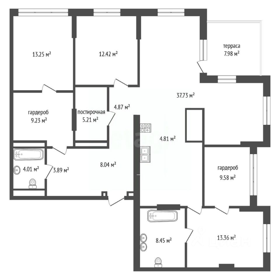 три спальни, одна из которых с собственным санузлом и гардеробной;