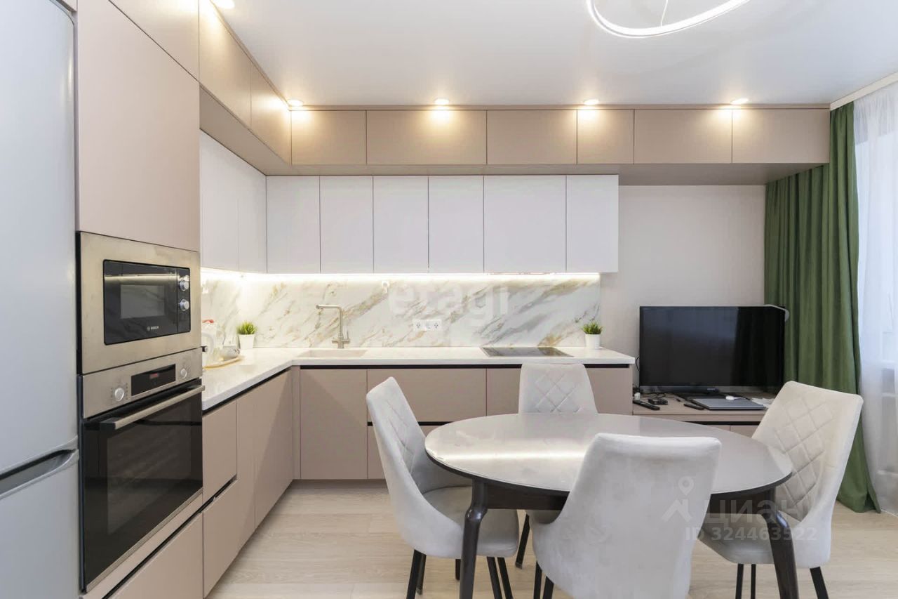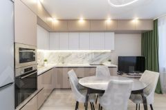 Просторная кухня-гостиная выглядит солидно благодаря современному кухонному гарнитуру и мебели. Встроенная бытовая техника Bosch будет отличным помощником для приготовления любимых блюд. Кухонный гарнитур с профессиональной фурнитурой фирмы Blum, столешница из искусственного камня очень практична в эксплуатации, фасады антивандальное покрытие устойчивое к царапинам, фартук широкоформатный керамогранит Италия.