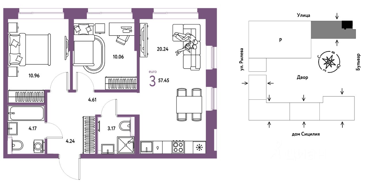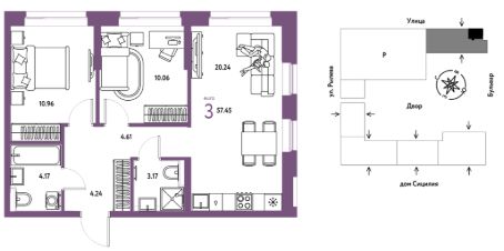 Продается 3комнатная квартира на 6 этаже от застройщика Страна Девелопмент. Площадь квартиры 57,45 кв. м.