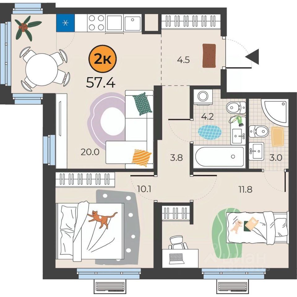 Общая площадь57,4 м²