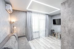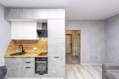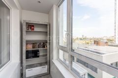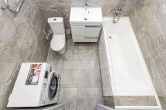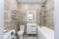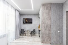 Стильный ремонт в серых тонах, выполнен "для себя", в отличном состоянии. Удобная планировка, просторная гардеробная. Тёплый балкон-кабинет с большими окнами — в квартире много света. Кондиционер. Кухонный гарнитур с встроенным холодильником и техникой. Санузел совмещённый, отделан современными качественными материалами.