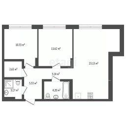 Планировка квартиры функциональна и соответствует современным стандартам: просторная кухня-гостиная 20.8 кв. м служит комфортным пространством для семейного времяпрепровождения, две изолированные комнаты обеспечивают приватность, а два санузла и отдельная гардеробная повышают уровень бытового удобства.
