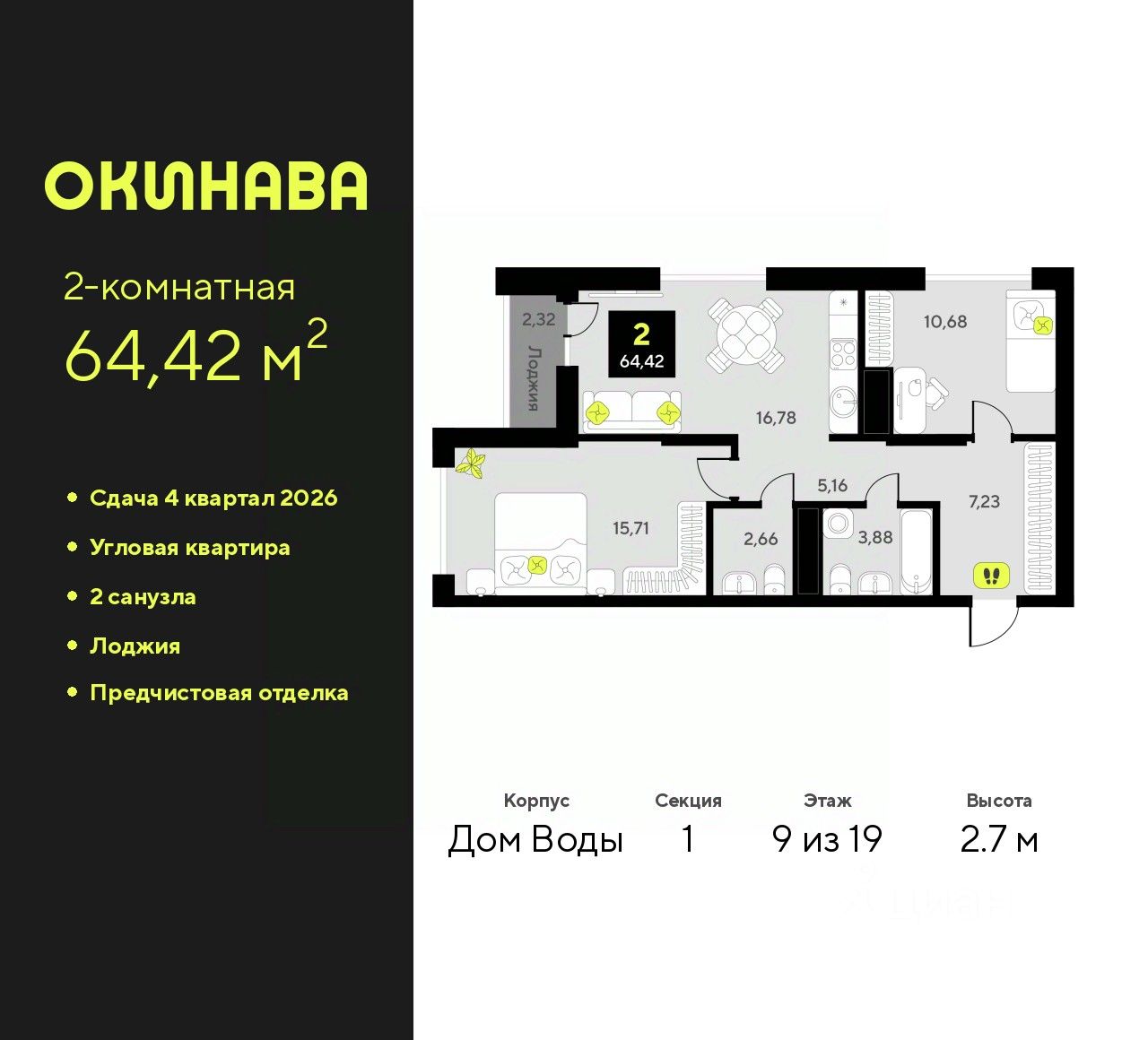 2-комн. квартира с предчистовой отделкой в ЖК "Окинава" на 9 этаже. Общая площадь: 64.42 кв.м., жилая: 26.39 кв.м., площадь просторной кухни-столовой: 16.78 кв.м. Угловая квартира, окна oбecпeчивaют paвнoмepнoe ocвeщeниe в тeчeниe дня. В квартире одна лоджия, один совмещенный и один раздельный санузел. Высота потолков 2.7 м.