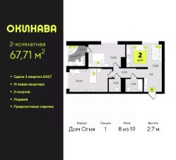 Просторная 2-комн. квартира с предчистовой отделкой в ЖК "Окинава" на 8 этаже. Общая площадь: 67.71 кв.м., жилая: 29.3 кв.м., площадь просторной кухни-столовой: 13.83 кв.м. Угловая квартира, окна oбecпeчивaют paвнoмepнoe ocвeщeниe в тeчeниe дня. В квартире одна лоджия, один совмещенный и один раздельный санузел. Высота потолков 2.7 м.