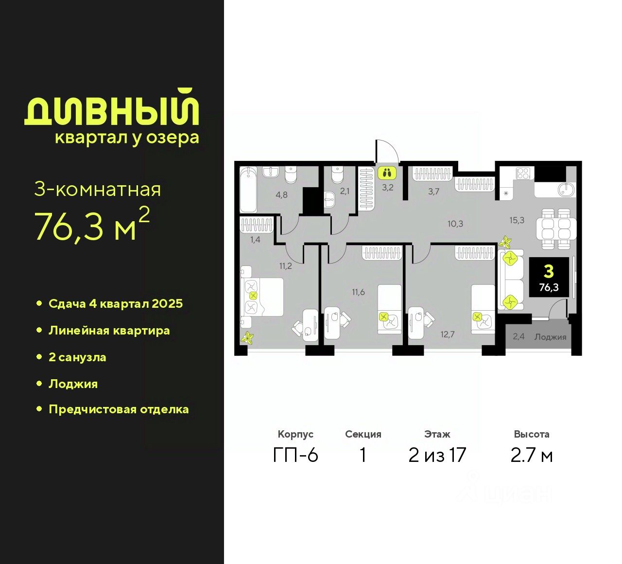 Трехкомнатная квартира с предчистовой отделкой в ЖК "Дивный квартал у озера" на 2 этаже. Общая площадь: 76.3 кв.м., жилая: 35.5 кв.м., площадь просторной кухни-столовой: 15.3 кв.м. Комнаты изолированные, все окна выходят на одну сторону. В квартире одна лоджия, один совмещенный и один раздельный санузел. Высота потолков 2.7 м.