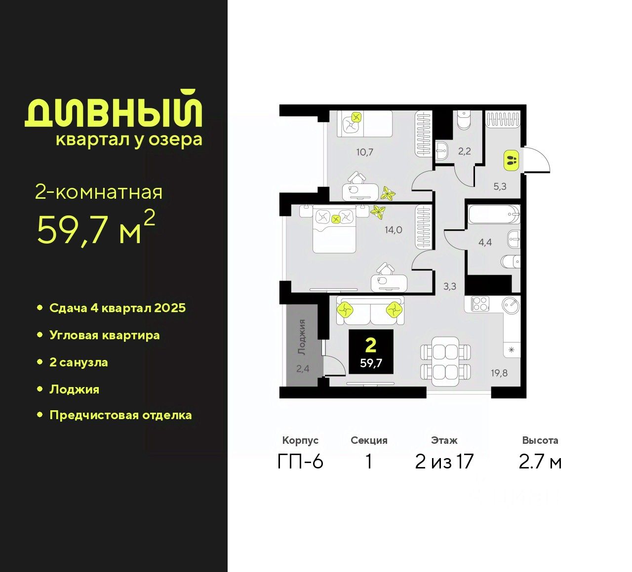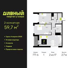 2-комн. квартира от застройщика с предчистовой отделкой в ЖК "Дивный квартал у озера" на 2 этаже. Общая площадь: 59.7 кв.м., жилая: 24.7 кв.м., площадь просторной кухни-столовой: 19.8 кв.м. Угловая квартира, окна oбecпeчивaют paвнoмepнoe ocвeщeниe в тeчeниe дня. В квартире одна лоджия, один совмещенный и один раздельный санузел. Высота потолков 2.7 м.