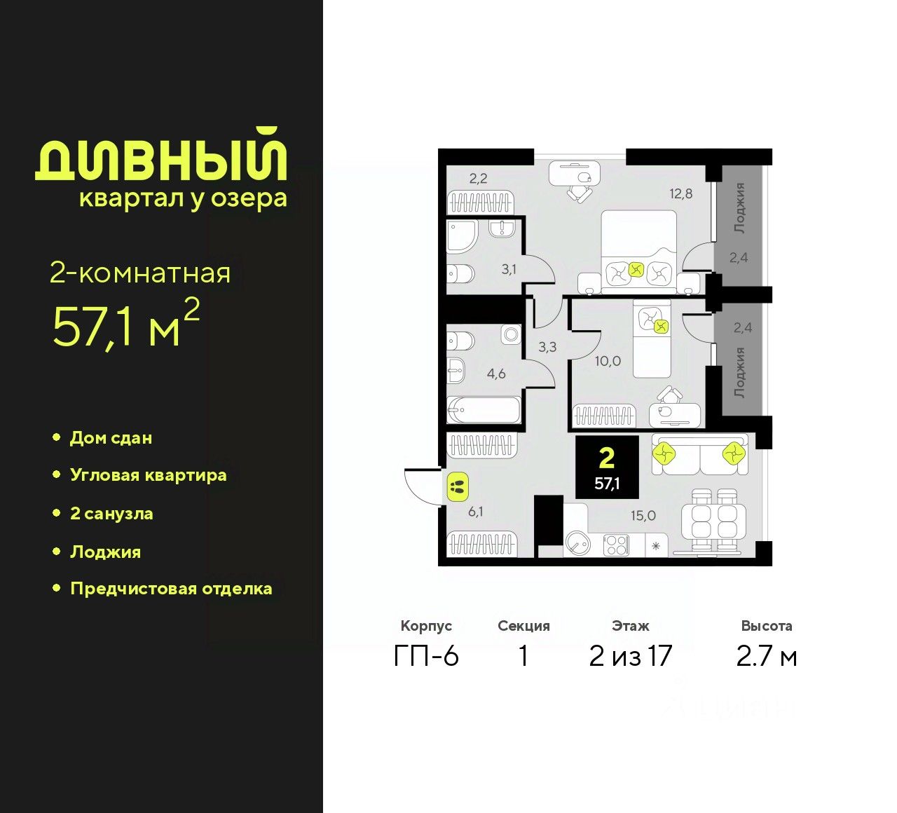Продается 2-комн. квартира с предчистовой отделкой в ЖК "Дивный квартал у озера" на 2 этаже. Общая площадь: 57.1 кв.м., жилая: 22.8 кв.м., площадь просторной кухни-столовой: 15 кв.м. Квартира угловая, идеально подойдет любителям тишины и панорамных видов. В квартире две лоджии, два совмещенных санузла. Высота потолков 2.7 м.