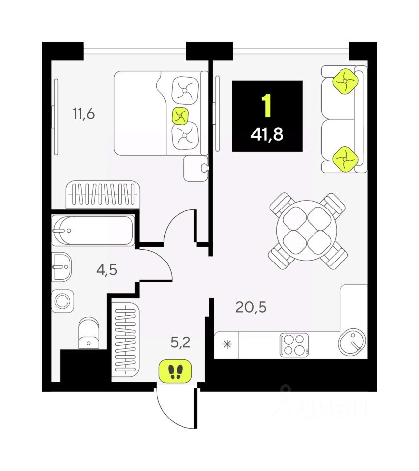 Продается однокомнатная квартира от застройщика с предчистовой отделкой в ЖК "Дивный квартал у озера" на 3 этаже. Общая площадь: 41.8 кв.м., жилая: 11.6 кв.м., площадь просторной кухни-столовой: 20.4 кв.м. Все окна выходят на одну сторону. В квартире один совмещенный санузел. Высота потолков 2.7 м.