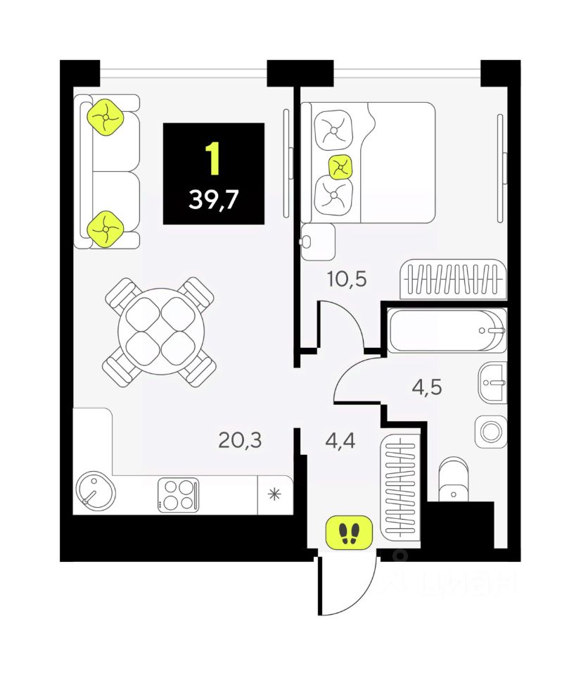Просторная однокомнатная квартира с предчистовой отделкой в ЖК "Дивный квартал у озера" на 3 этаже. Общая площадь: 39.7 кв.м., жилая: 10.5 кв.м., площадь просторной кухни-столовой: 20.3 кв.м. Все окна выходят на одну сторону. В квартире один совмещенный санузел. Высота потолков 2.7 м.