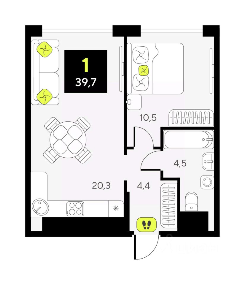 Просторная 1-комн. квартира с предчистовой отделкой в ЖК "Дивный квартал у озера" на 4 этаже. Общая площадь: 39.7 кв.м., жилая: 10.5 кв.м., площадь просторной кухни-столовой: 20.3 кв.м. Все окна выходят на одну сторону. В квартире один совмещенный санузел. Высота потолков 2.7 м.