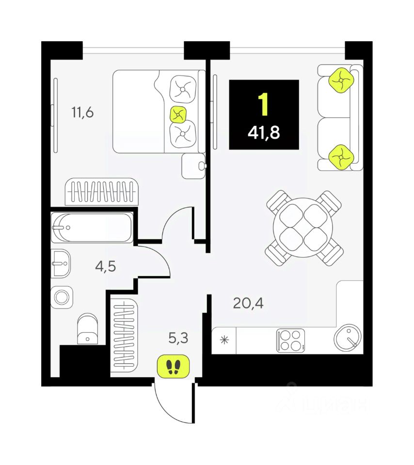 1-комн. квартира от застройщика с предчистовой отделкой в ЖК "Дивный квартал у озера" на 5 этаже. Общая площадь: 41.8 кв.м., жилая: 11.6 кв.м., площадь просторной кухни-столовой: 20.4 кв.м. Все окна выходят на одну сторону. В квартире один совмещенный санузел. Высота потолков 2.7 м.