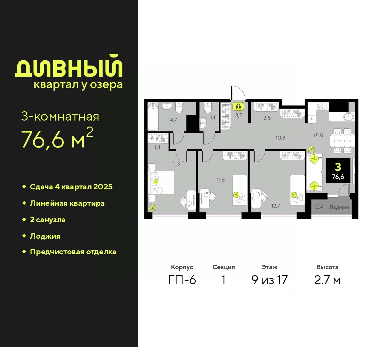 Продается трехкомнатная квартира с предчистовой отделкой в ЖК "Дивный квартал у озера" на 9 этаже. Общая площадь: 76.6 кв.м., жилая: 35.6 кв.м., площадь просторной кухни-столовой: 15.5 кв.м. Комнаты изолированные, все окна выходят на одну сторону. В квартире одна лоджия, один совмещенный и один раздельный санузел. Высота потолков 2.7 м.
