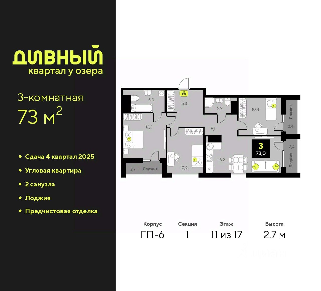 3-комн. квартира от застройщика с предчистовой отделкой в ЖК "Дивный квартал у озера" на 11 этаже. Общая площадь: 73 кв.м., жилая: 33.5 кв.м., площадь просторной кухни-столовой: 18.2 кв.м. Квартира угловая, очень светлая, естественная вентиляция при открытии окон. В квартире две лоджии, два совмещенных санузла. Высота потолков 2.7 м.