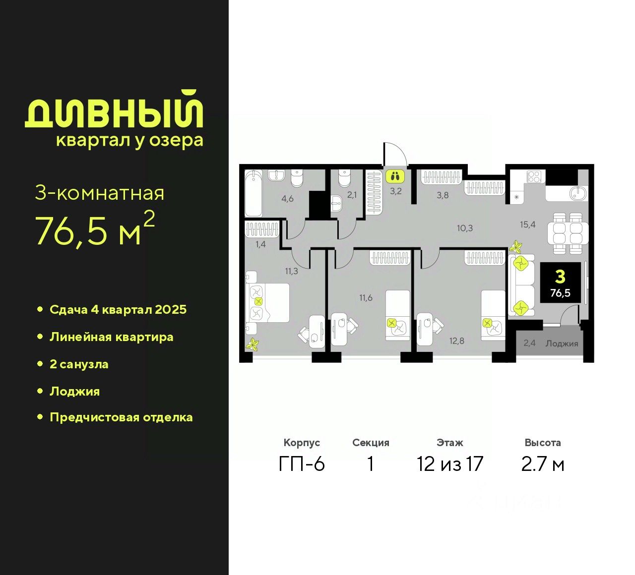 3-комн. квартира от застройщика с предчистовой отделкой в ЖК "Дивный квартал у озера" на 12 этаже. Общая площадь: 76.5 кв.м., жилая: 35.7 кв.м., площадь просторной кухни-столовой: 15.4 кв.м. Комнаты изолированные, все окна выходят на одну сторону. В квартире одна лоджия, один совмещенный и один раздельный санузел. Высота потолков 2.7 м.