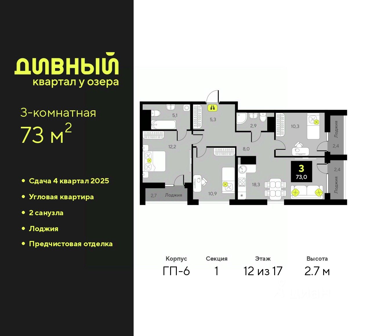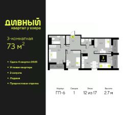 Продается трехкомнатная квартира от застройщика с предчистовой отделкой в ЖК "Дивный квартал у озера" на 12 этаже. Общая площадь: 73 кв.м., жилая: 33.5 кв.м., площадь просторной кухни-столовой: 18.2 кв.м. Квартира угловая, окна oбecпeчивaют paвнoмepнoe ocвeщeниe в тeчeниe дня. В квартире две лоджии, два совмещенных санузла. Высота потолков 2.7 м.
