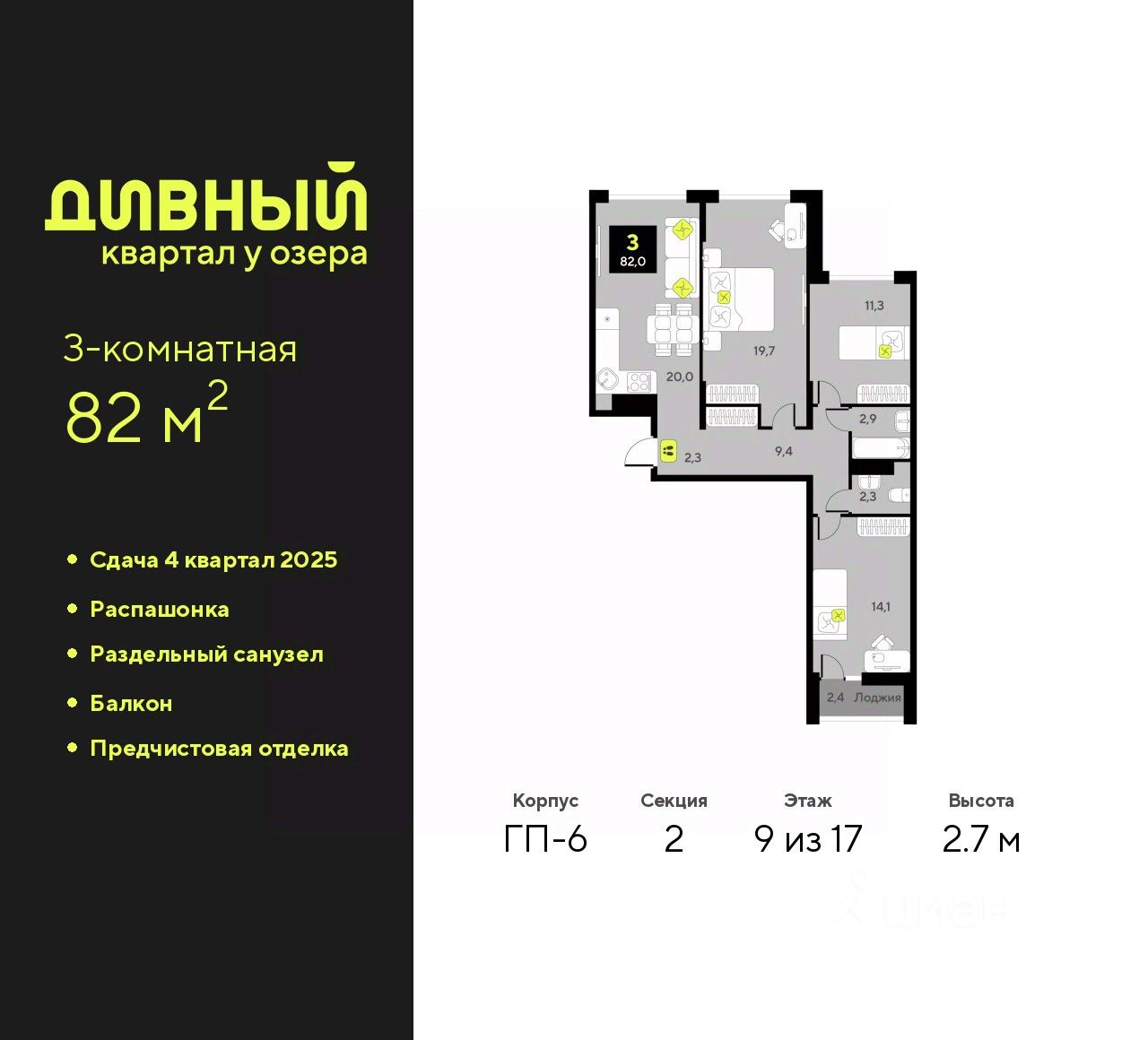 Просторная 3-комн. квартира с предчистовой отделкой в ЖК "Дивный квартал у озера" на 9 этаже. Общая площадь: 82 кв.м., жилая: 45.1 кв.м., площадь просторной кухни-столовой: 20 кв.м. Квартира - распашонка, без проходных комнат, окна выходят на paзные стороны дома. В квартире один балкон, один раздельный санузел. Высота потолков 2.7 м.
