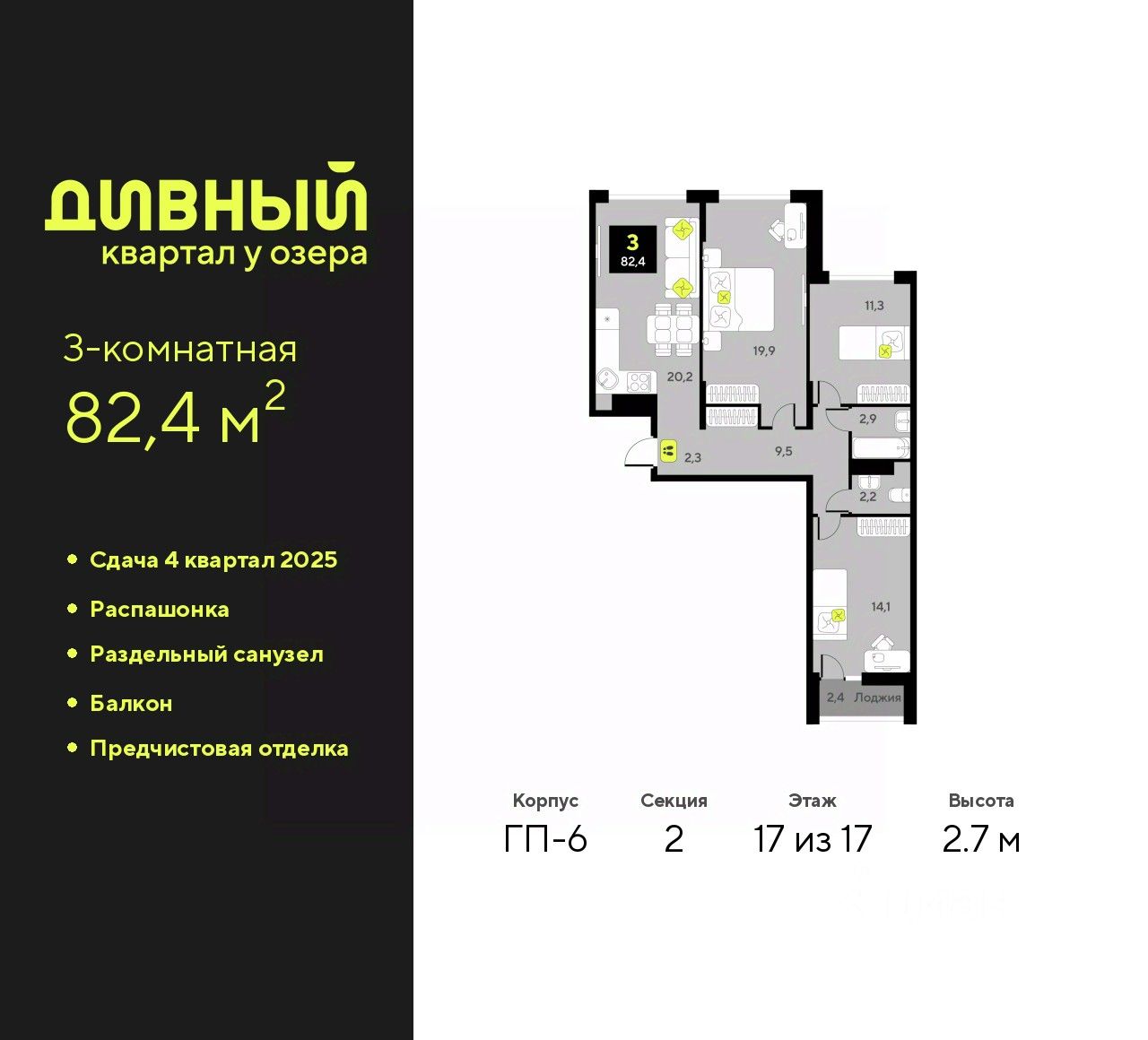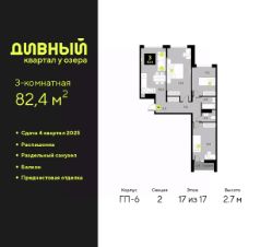 Продается трехкомнатная квартира с предчистовой отделкой в ЖК "Дивный квартал у озера" на 17 этаже. Общая площадь: 82.4 кв.м., жилая: 45.3 кв.м., площадь просторной кухни-столовой: 20.1 кв.м. Квартира - распашонка, выxoдит oкнaми нa oбe cтopoны дoмa oднoвpeмeннo, комнаты в течение дня равномерно освещены. В квартире один балкон, один раздельный санузел. Высота потолков 2.7 м.