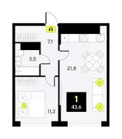 Продается 1-комн. квартира с предчистовой отделкой в ЖК "Дивный квартал у озера" на 17 этаже. Общая площадь: 43.6 кв.м., жилая: 11.2 кв.м., площадь просторной кухни-столовой: 21.9 кв.м. Все окна выходят на одну сторону. В квартире один совмещенный санузел. Высота потолков 2.7 м.