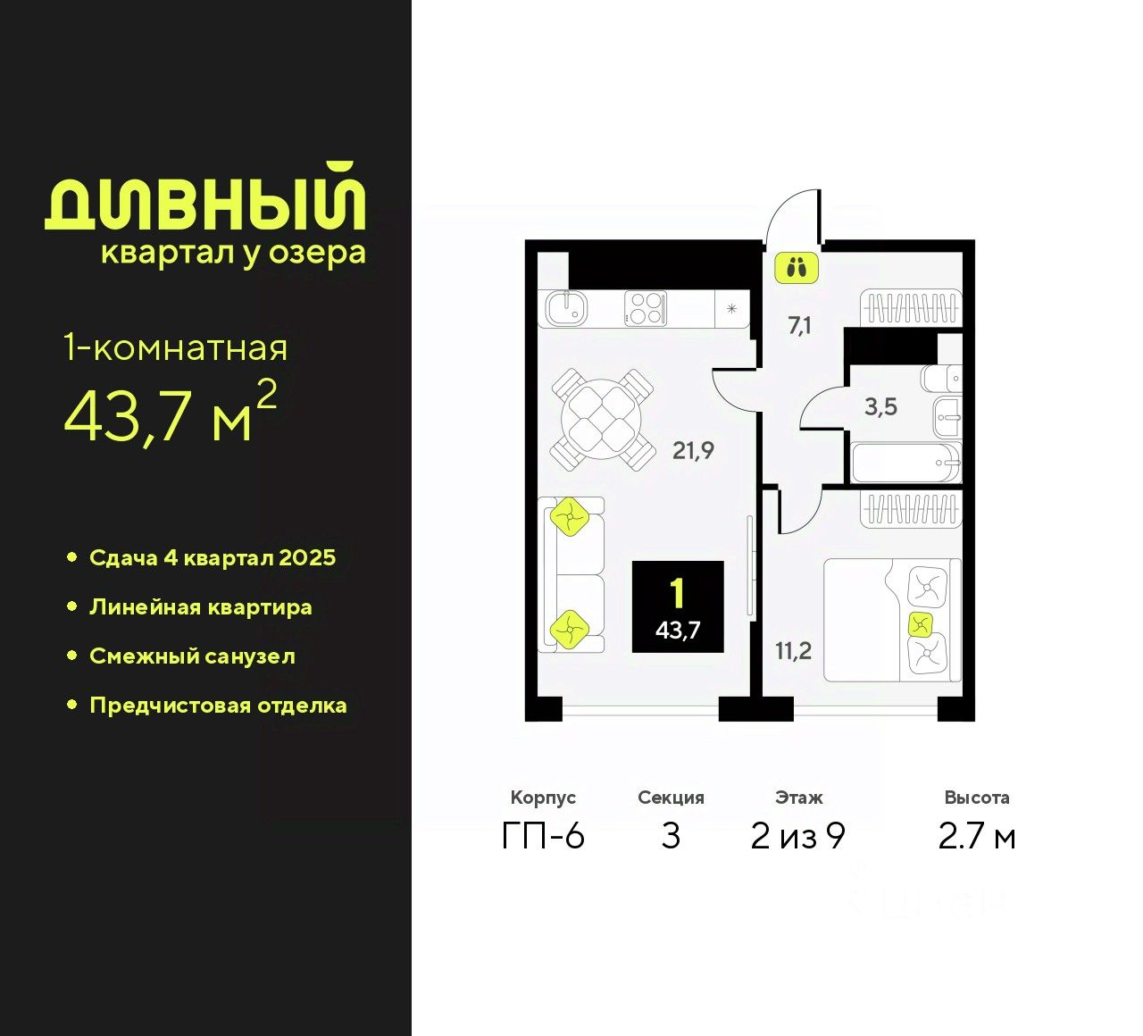 1-комн. квартира с предчистовой отделкой в ЖК "Дивный квартал у озера" на 2 этаже. Общая площадь: 43.7 кв.м., жилая: 11.2 кв.м., площадь просторной кухни-столовой: 21.9 кв.м. Все окна выходят на одну сторону. В квартире один совмещенный санузел. Высота потолков 2.7 м.