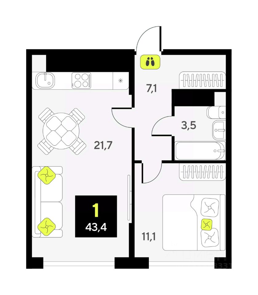 Просторная однокомнатная квартира с предчистовой отделкой в ЖК "Дивный квартал у озера" на 9 этаже. Общая площадь: 43.4 кв.м., жилая: 11.1 кв.м., площадь просторной кухни-столовой: 21.7 кв.м. Все окна выходят на одну сторону. В квартире один совмещенный санузел. Высота потолков 2.7 м.