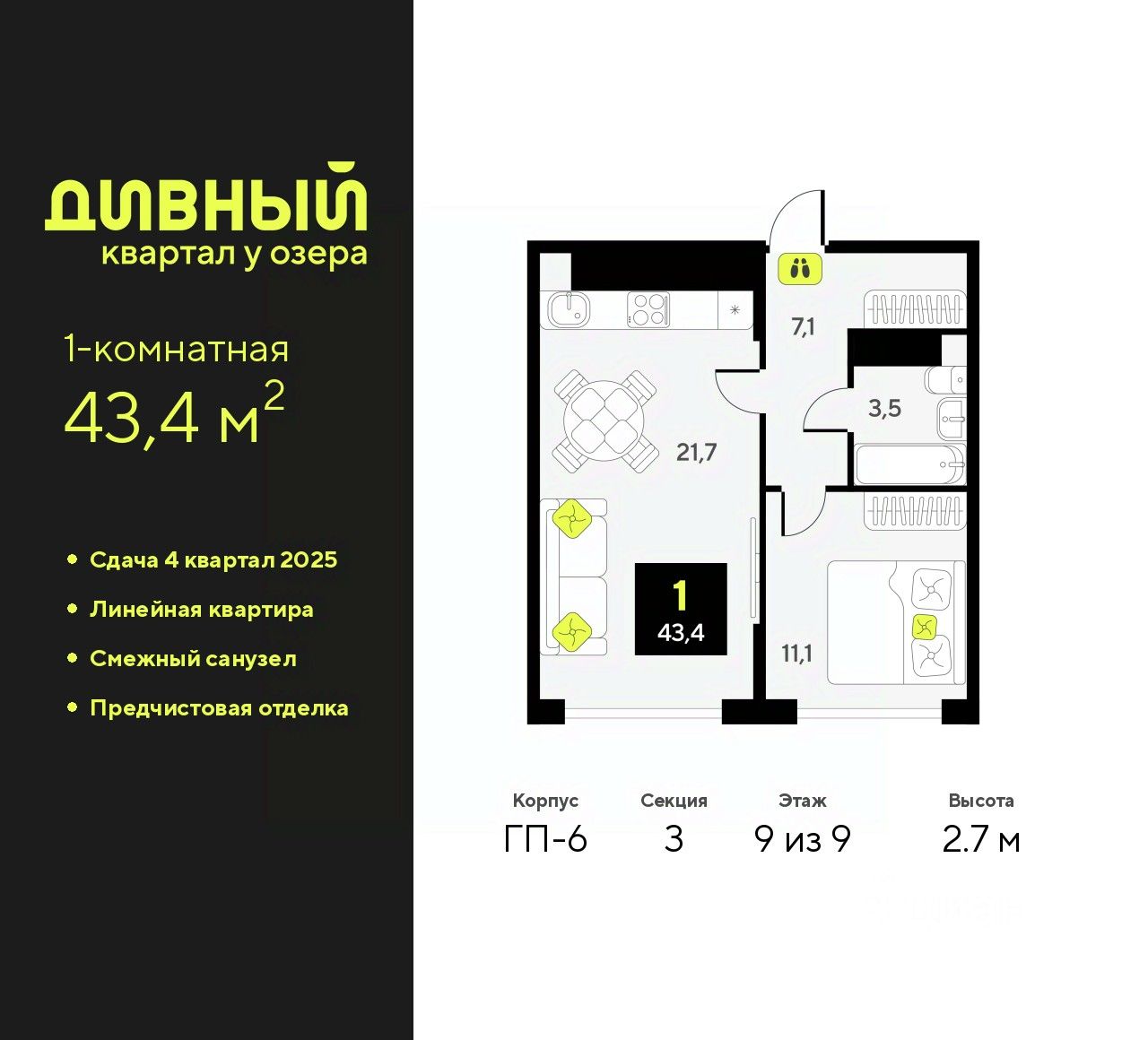 1-комн. квартира от застройщика с предчистовой отделкой в ЖК "Дивный квартал у озера" на 9 этаже. Общая площадь: 43.4 кв.м., жилая: 11.1 кв.м., площадь просторной кухни-столовой: 21.7 кв.м. Все окна выходят на одну сторону. В квартире один совмещенный санузел. Высота потолков 2.7 м.