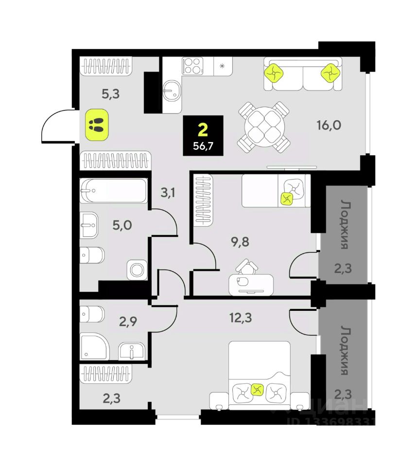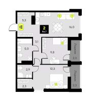 2-комн. квартира с предчистовой отделкой в ЖК "Дивный квартал у озера" на 6 этаже. Общая площадь: 56.7 кв.м., жилая: 22.1 кв.м., площадь просторной кухни-столовой: 16 кв.м. Комнаты изолированные, все окна выходят на одну сторону. В квартире две лоджии, два совмещенных санузла. Высота потолков 2.7 м.