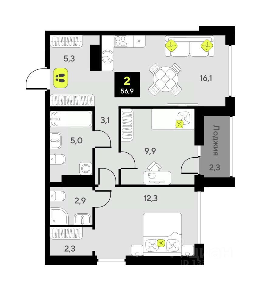 Продается двухкомнатная квартира от застройщика с предчистовой отделкой в ЖК "Дивный квартал у озера" на 7 этаже. Общая площадь: 56.9 кв.м., жилая: 22.2 кв.м., площадь просторной кухни-столовой: 16.1 кв.м. Квартира угловая, идеально подойдет любителям тишины и панорамных видов. В квартире одна лоджия, два совмещенных санузла. Высота потолков 2.7 м.