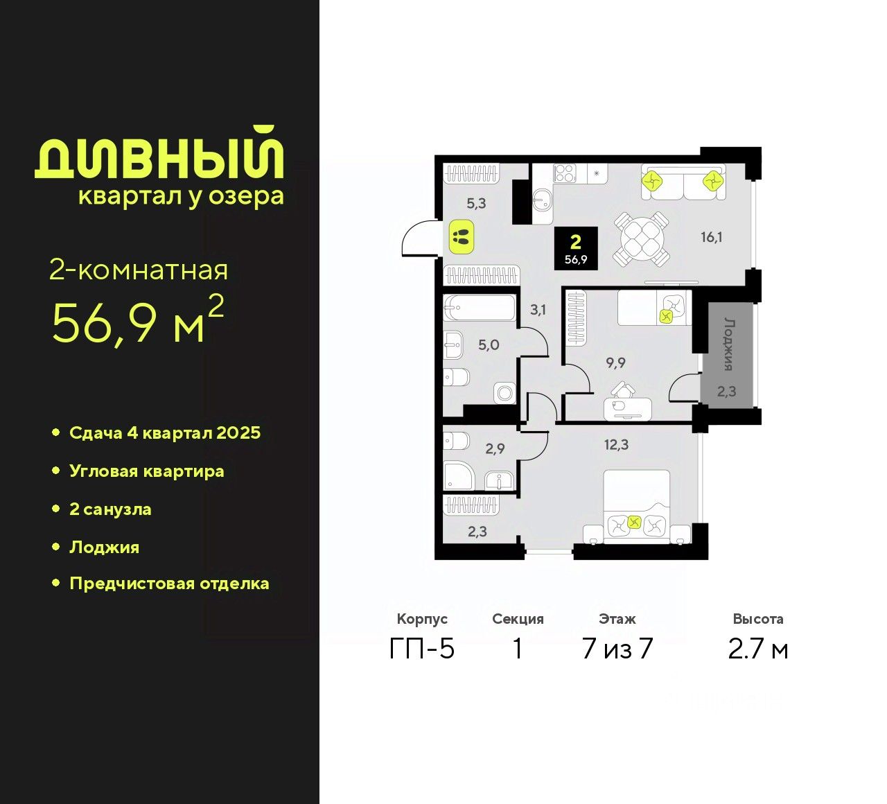 2-комн. квартира с предчистовой отделкой в ЖК "Дивный квартал у озера" на 7 этаже. Общая площадь: 56.9 кв.м., жилая: 22.2 кв.м., площадь просторной кухни-столовой: 16.1 кв.м. Угловая квартира, очень светлая, естественная вентиляция при открытии окон. В квартире одна лоджия, два совмещенных санузла. Высота потолков 2.7 м.