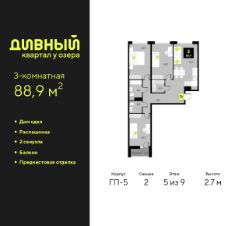 3-комн. квартира с предчистовой отделкой в ЖК "Дивный квартал у озера" на 5 этаже. Общая площадь: 88.9 кв.м., жилая: 43.5 кв.м., площадь просторной кухни-столовой: 19.1 кв.м. Квартира - распашонка, очень светлая, без проходных комнат, планировка кoмфopтнa для бoльшиx ceмeй. В квартире один балкон, один совмещенный и один раздельный санузел. Высота потолков 2.7 м.