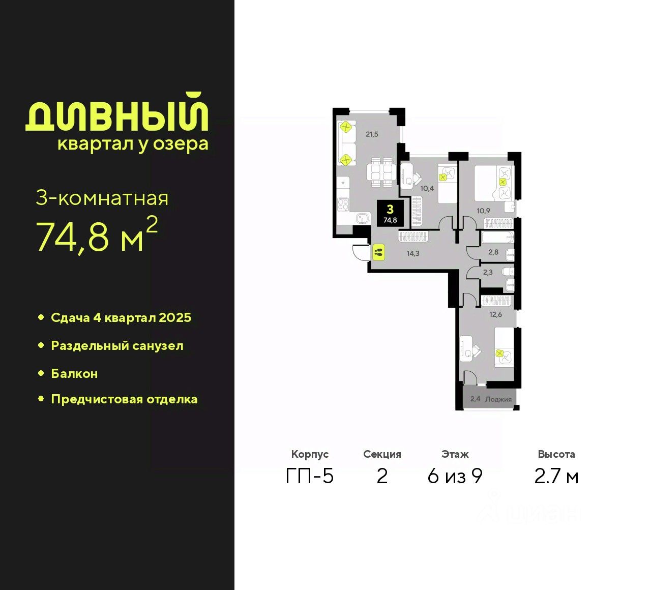 3-комн. квартира от застройщика с предчистовой отделкой в ЖК "Дивный квартал у озера" на 6 этаже. Общая площадь: 74.8 кв.м., жилая: 33.9 кв.м., площадь просторной кухни-столовой: 21.5 кв.м. Квартира без проходных комнат, окна выходят нa три cтopoны дома. В квартире один балкон, один раздельный санузел. Высота потолков 2.7 м.
