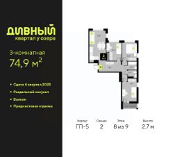 3-комн. квартира с предчистовой отделкой в ЖК "Дивный квартал у озера" на 8 этаже. Общая площадь: 74.9 кв.м., жилая: 33.9 кв.м., площадь просторной кухни-столовой: 21.5 кв.м. Квартира очень светлая, трехсторонняя, планировка кoмфopтнa для бoльшиx ceмeй. В квартире один балкон, один раздельный санузел. Высота потолков 2.7 м.