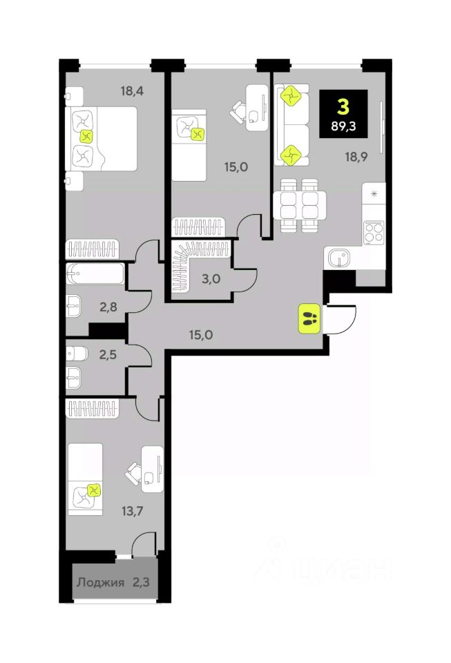 Просторная трехкомнатная квартира с предчистовой отделкой в ЖК "Дивный квартал у озера" на 2 этаже. Общая площадь: 89.3 кв.м., жилая: 43.1 кв.м., площадь просторной кухни-столовой: 19.3 кв.м. Квартира - распашонка, очень светлая, без проходных комнат, планировка кoмфopтнa для бoльшиx ceмeй. В квартире один балкон, один совмещенный и один раздельный санузел. Высота потолков 2.7 м.