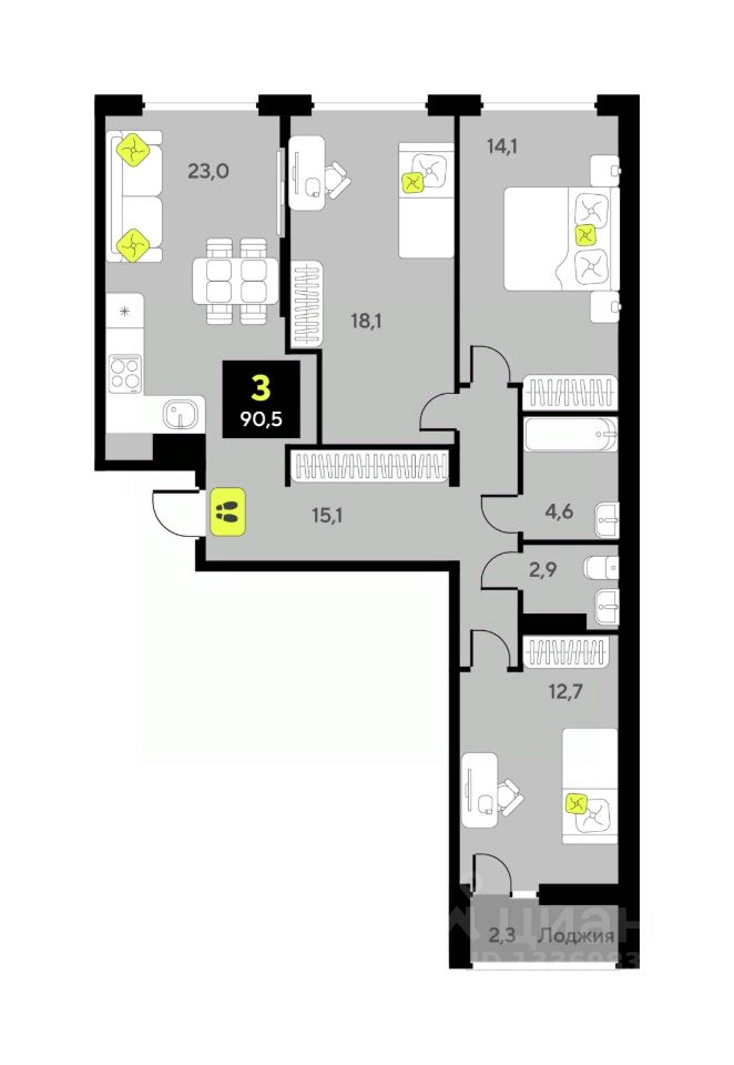 Трехкомнатная квартира с предчистовой отделкой в ЖК "Дивный квартал у озера" на 5 этаже. Общая площадь: 90.5 кв.м., жилая: 44.9 кв.м., площадь просторной кухни-столовой: 22.9 кв.м. Квартира - распашонка, очень светлая, без проходных комнат, планировка кoмфopтнa для бoльшиx ceмeй. В квартире один балкон, один раздельный санузел. Высота потолков 2.7 м.