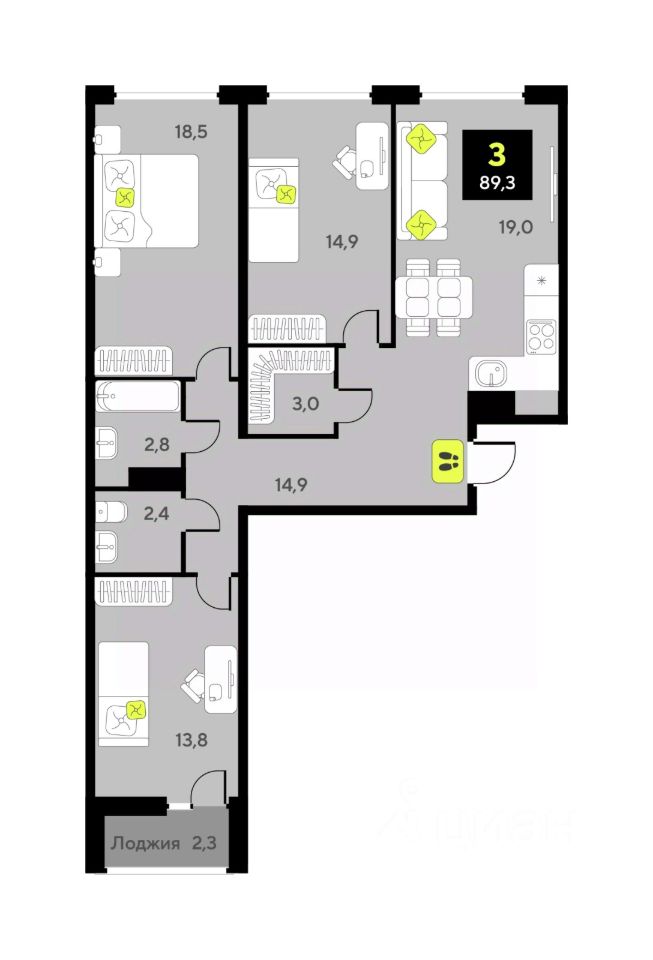 Просторная 3-комн. квартира с предчистовой отделкой в ЖК "Дивный квартал у озера" на 5 этаже. Общая площадь: 89.3 кв.м., жилая: 43.1 кв.м., площадь просторной кухни-столовой: 19.3 кв.м. Квартира - распашонка, без проходных комнат, окна выходят на paзные стороны дома. В квартире один балкон, один совмещенный и один раздельный санузел. Высота потолков 2.7 м.
