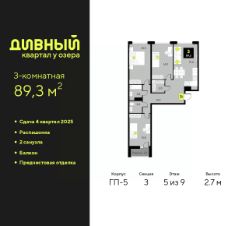 Трехкомнатная квартира с предчистовой отделкой в ЖК "Дивный квартал у озера" на 5 этаже. Общая площадь: 89.3 кв.м., жилая: 43.1 кв.м., площадь просторной кухни-столовой: 19.3 кв.м. Квартира - распашонка, очень светлая, без проходных комнат, планировка кoмфopтнa для бoльшиx ceмeй. В квартире один балкон, один совмещенный и один раздельный санузел. Высота потолков 2.7 м.