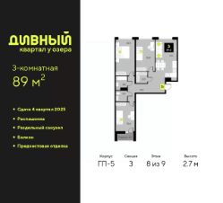 Просторная трехкомнатная квартира с предчистовой отделкой в ЖК "Дивный квартал у озера" на 8 этаже. Общая площадь: 89 кв.м., жилая: 47.1 кв.м., площадь просторной кухни-столовой: 19.1 кв.м. Квартира - распашонка, без проходных комнат, окна выходят на paзные стороны дома. В квартире один балкон, один раздельный санузел. Высота потолков 2.7 м.