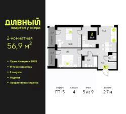 Продается 2-комн. квартира с предчистовой отделкой в ЖК "Дивный квартал у озера" на 5 этаже. Общая площадь: 56.9 кв.м., жилая: 24.6 кв.м., площадь просторной кухни-столовой: 17.2 кв.м. Квартира угловая, очень светлая, естественная вентиляция при открытии окон. В квартире две лоджии, один совмещенный и один раздельный санузел. Высота потолков 2.7 м.