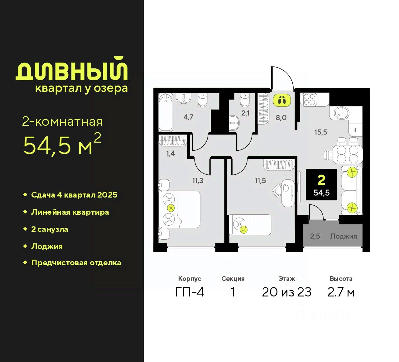 2-комн. квартира с предчистовой отделкой в ЖК "Дивный квартал у озера" на 20 этаже. Общая площадь: 54.5 кв.м., жилая: 22.8 кв.м., площадь просторной кухни-столовой: 15.5 кв.м. Комнаты изолированные, все окна выходят на одну сторону. В квартире одна лоджия, один совмещенный и один раздельный санузел. Высота потолков 2.7 м.