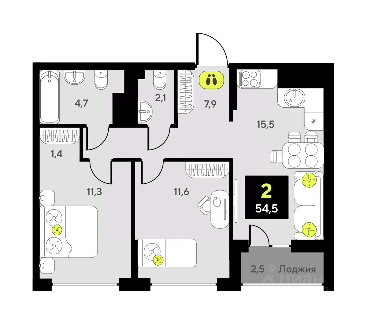 Просторная 2-комн. квартира с предчистовой отделкой в ЖК "Дивный квартал у озера" на 22 этаже. Общая площадь: 54.5 кв.м., жилая: 22.8 кв.м., площадь просторной кухни-столовой: 15.5 кв.м. Комнаты изолированные, все окна выходят на одну сторону. В квартире одна лоджия, один совмещенный и один раздельный санузел. Высота потолков 2.7 м.