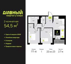 Двухкомнатная квартира от застройщика с предчистовой отделкой в ЖК "Дивный квартал у озера" на 22 этаже. Общая площадь: 54.5 кв.м., жилая: 22.8 кв.м., площадь просторной кухни-столовой: 15.5 кв.м. Комнаты изолированные, все окна выходят на одну сторону. В квартире одна лоджия, один совмещенный и один раздельный санузел. Высота потолков 2.7 м.