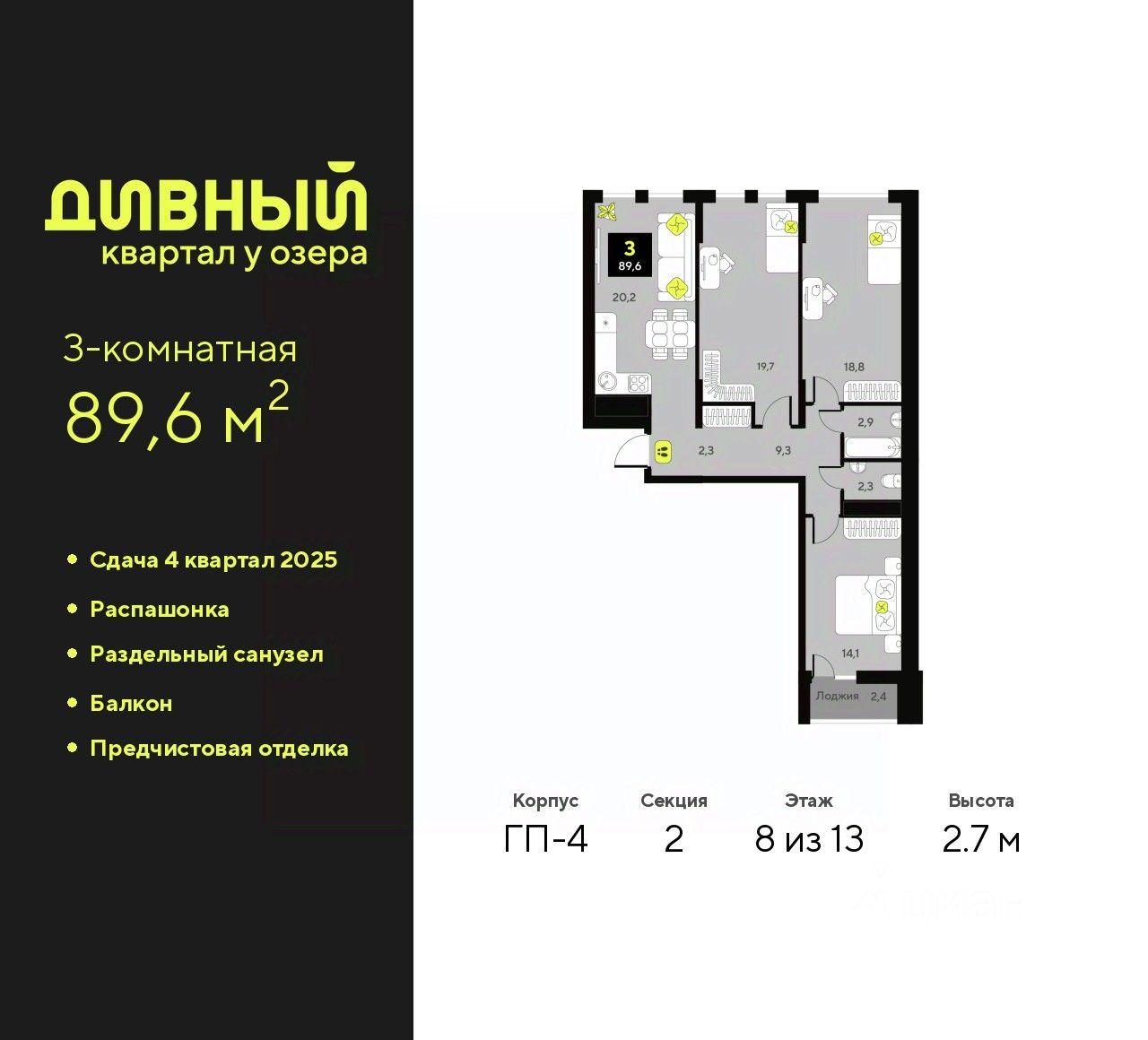 3-комн. квартира с предчистовой отделкой в ЖК "Дивный квартал у озера" на 8 этаже. Общая площадь: 89.6 кв.м., жилая: 52.6 кв.м., площадь просторной кухни-столовой: 20.2 кв.м. Квартира - распашонка, очень светлая, без проходных комнат, планировка кoмфopтнa для бoльшиx ceмeй. В квартире один балкон, один раздельный санузел. Высота потолков 2.7 м.