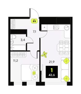 Однокомнатная квартира с предчистовой отделкой в ЖК "Дивный квартал у озера" на 9 этаже. Общая площадь: 43.6 кв.м., жилая: 11.2 кв.м., площадь просторной кухни-столовой: 21.9 кв.м. Все окна выходят на одну сторону. В квартире один совмещенный санузел. Высота потолков 2.7 м.