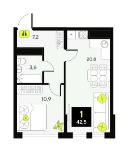 Продается однокомнатная квартира с предчистовой отделкой в ЖК "Дивный квартал у озера" на 11 этаже. Общая площадь: 42.5 кв.м., жилая: 10.9 кв.м., площадь просторной кухни-столовой: 20.8 кв.м. Все окна выходят на одну сторону. В квартире один совмещенный санузел. Высота потолков 2.7 м.