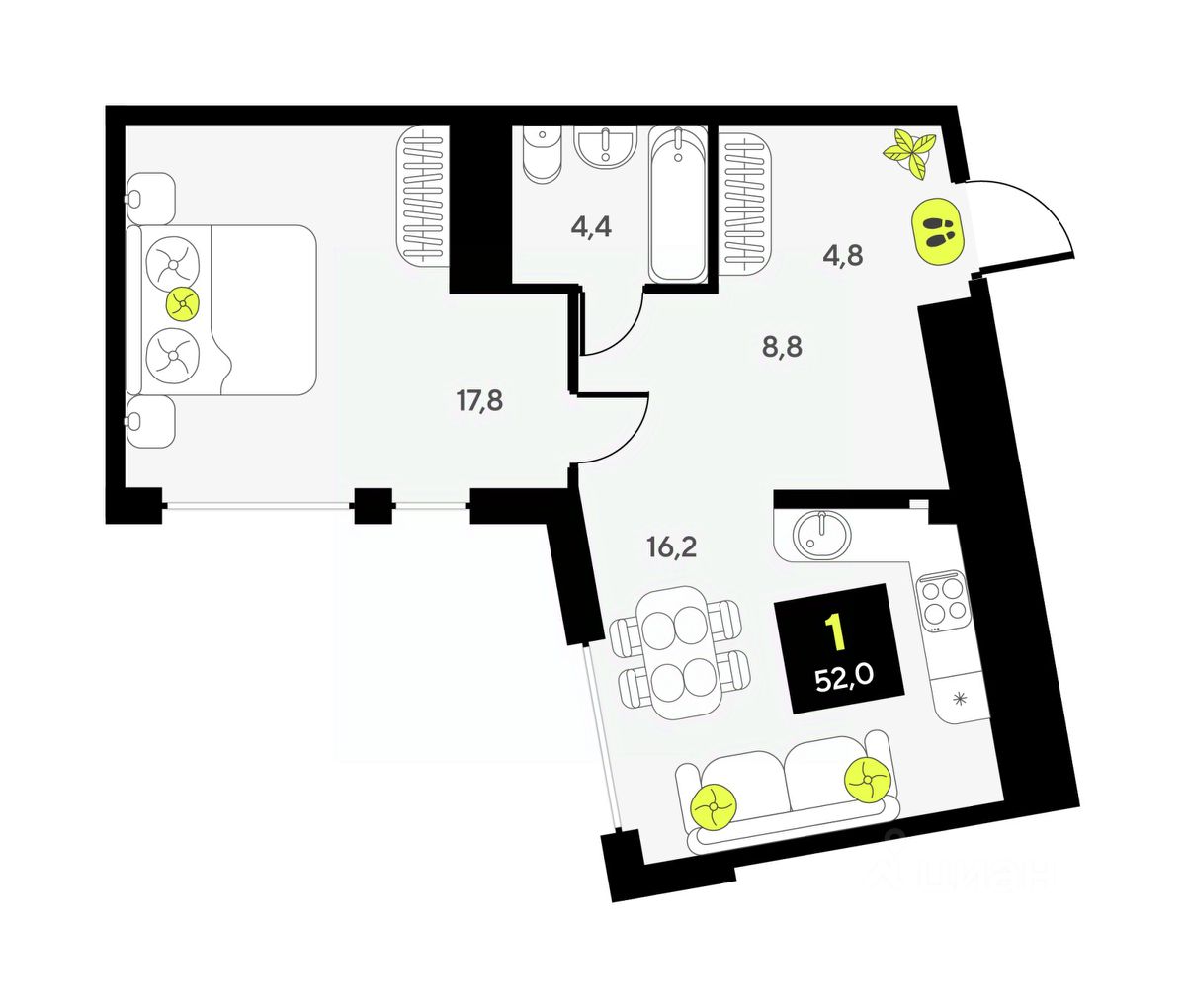 Однокомнатная квартира от застройщика с предчистовой отделкой в ЖК "Дивный квартал у озера" на 2 этаже. Общая площадь: 52 кв.м., жилая: 17.8 кв.м., площадь просторной кухни-столовой: 16.2 кв.м. Угловая квартира, очень светлая, естественная вентиляция при открытии окон. В квартире один совмещенный санузел. Высота потолков 2.7 м.