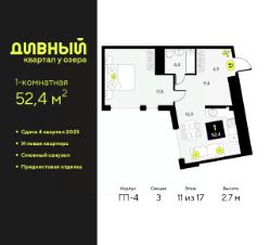 Однокомнатная квартира с предчистовой отделкой в ЖК "Дивный квартал у озера" на 11 этаже. Общая площадь: 52.4 кв.м., жилая: 17.8 кв.м., площадь просторной кухни-столовой: 15.9 кв.м. Квартира угловая, идеально подойдет любителям тишины и панорамных видов. В квартире один совмещенный санузел. Высота потолков 2.7 м.