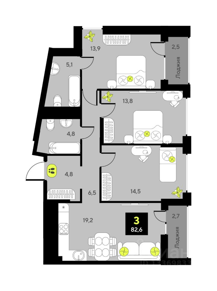 3-комн. квартира от застройщика с предчистовой отделкой в ЖК "Дивный квартал у озера" на 12 этаже. Общая площадь: 82.6 кв.м., жилая: 42.1 кв.м., площадь просторной кухни-столовой: 19 кв.м. Комнаты изолированные, все окна выходят на одну сторону. В квартире две лоджии, два совмещенных санузла. Высота потолков 2.7 м.