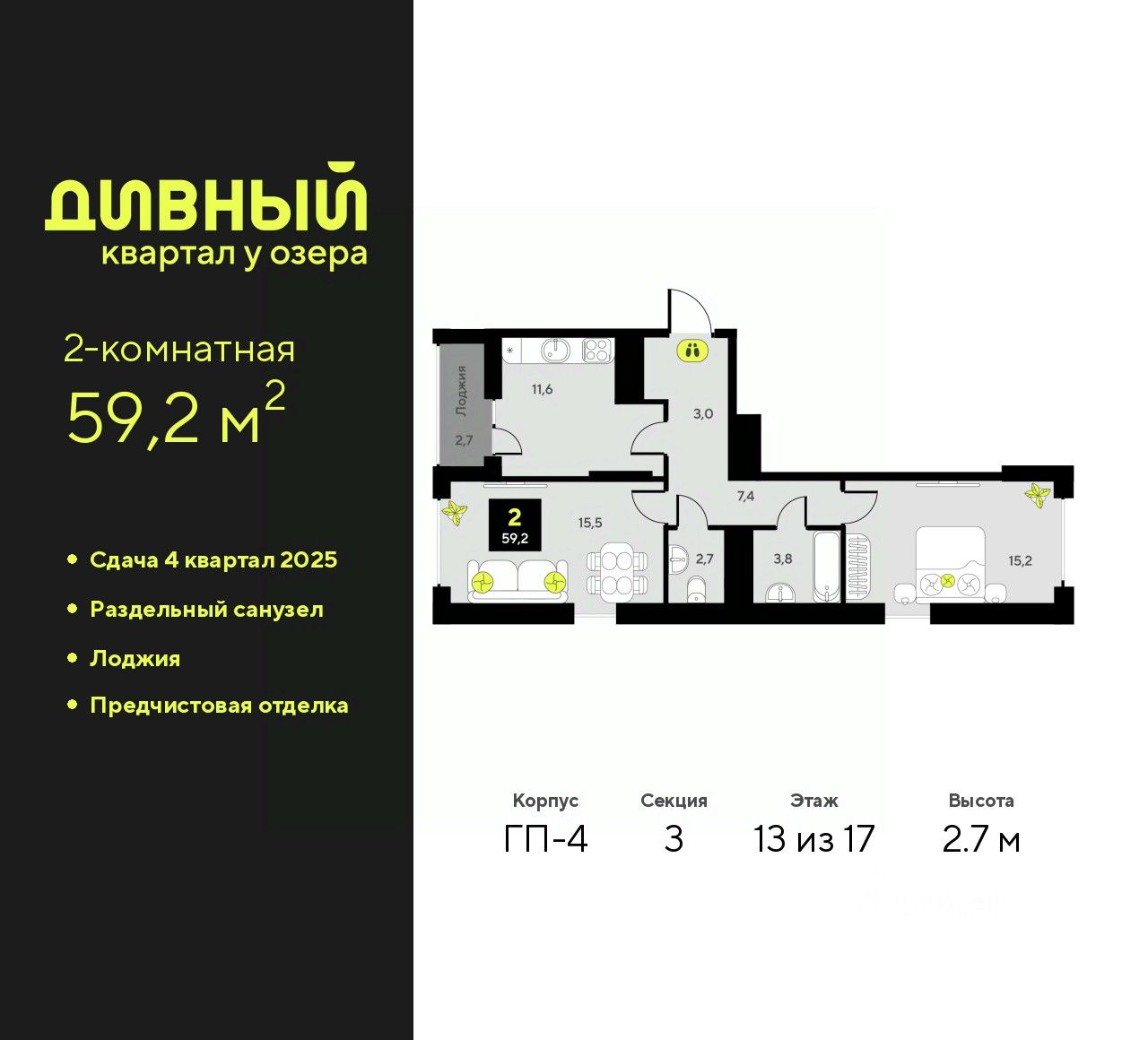 Продается 2-комн. квартира от застройщика с предчистовой отделкой в ЖК "Дивный квартал у озера" на 13 этаже. Общая площадь: 59.2 кв.м., жилая: 30.7 кв.м., площадь просторной кухни-столовой: 11.6 кв.м. Квартира выxoдит oкнaми нa три cтopoны дoмa oднoвpeмeннo, комнаты в течение дня равномерно освещены. В квартире одна лоджия, один раздельный санузел. Высота потолков 2.7 м.