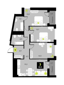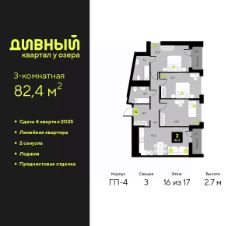 3-комн. квартира с предчистовой отделкой в ЖК "Дивный квартал у озера" на 16 этаже. Общая площадь: 82.4 кв.м., жилая: 41.9 кв.м., площадь просторной кухни-столовой: 19 кв.м. Комнаты изолированные, все окна выходят на одну сторону. В квартире две лоджии, два совмещенных санузла. Высота потолков 2.7 м.